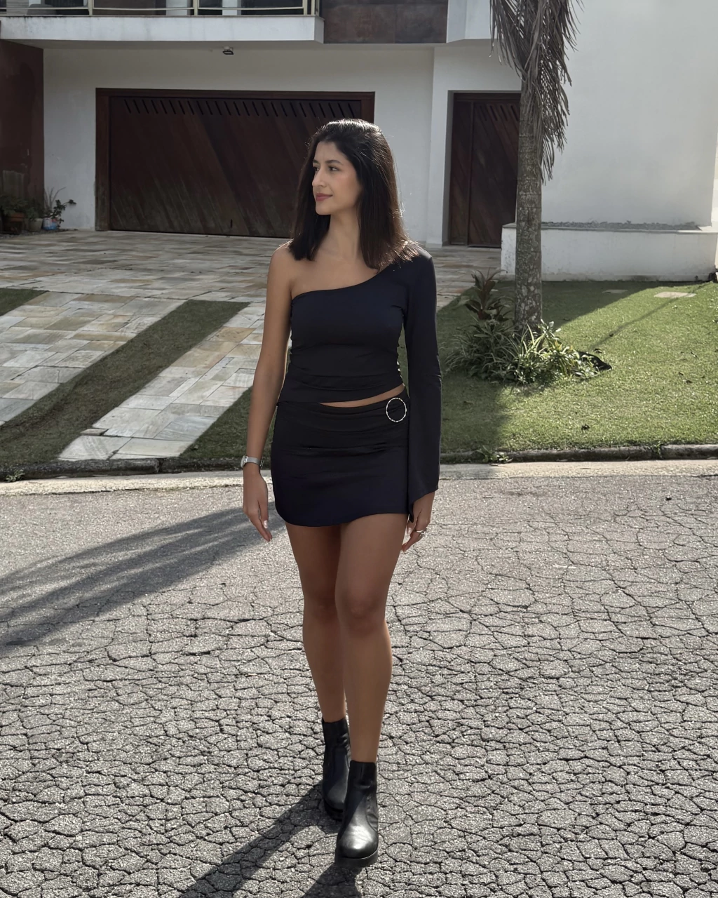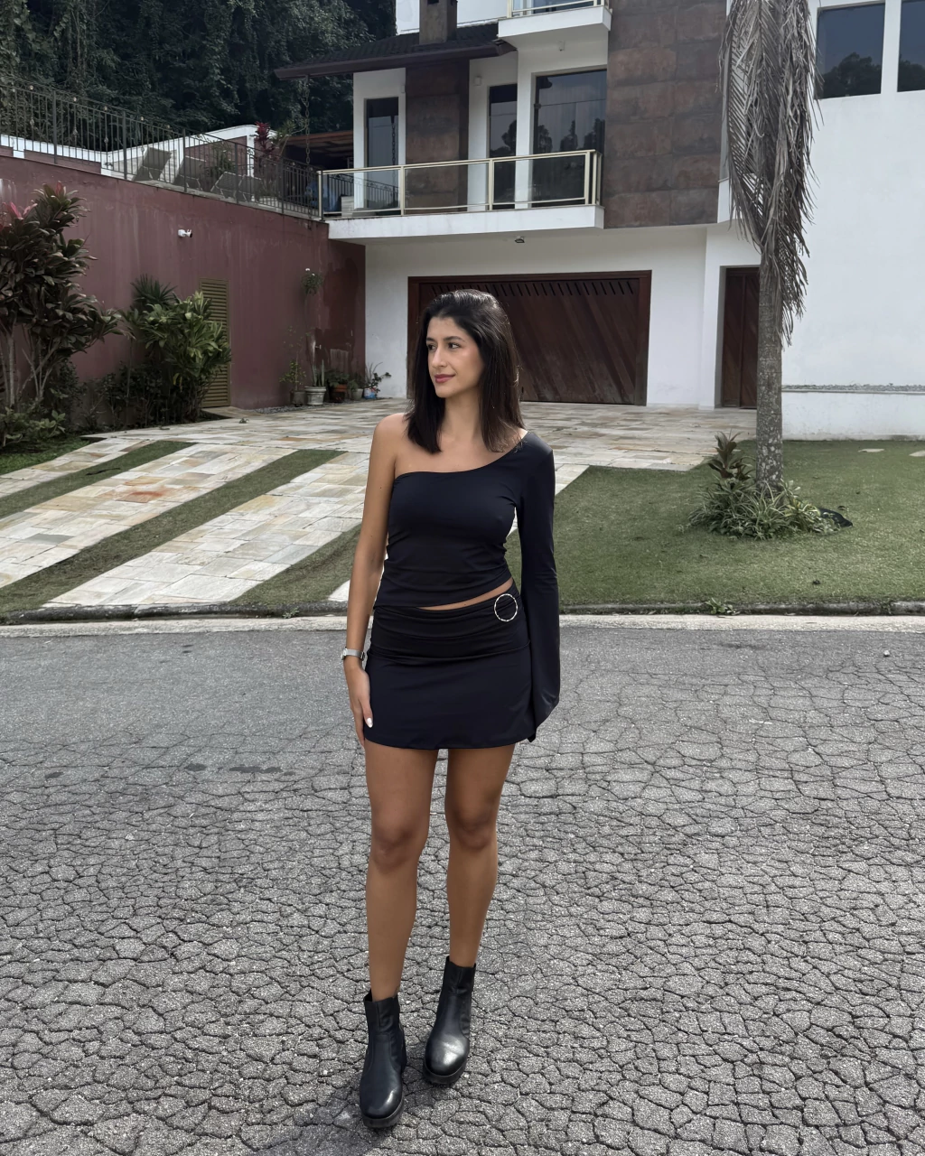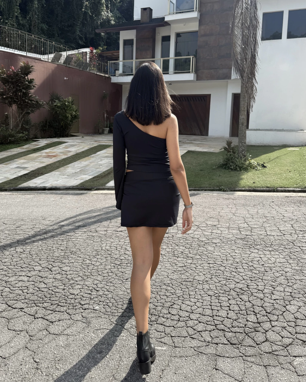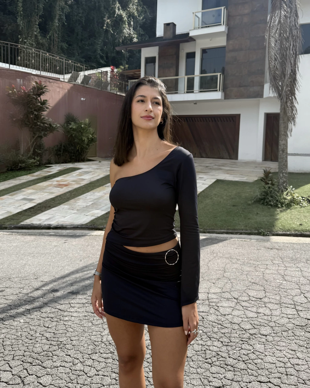 Blusa Noir, disponível nas cores preta e marrom, de uma manga só, assimétrica, ela traz um design moderno e elegante, do casual ao sofisticado. Tecido firme, de ótima sustenção e sem transparência.