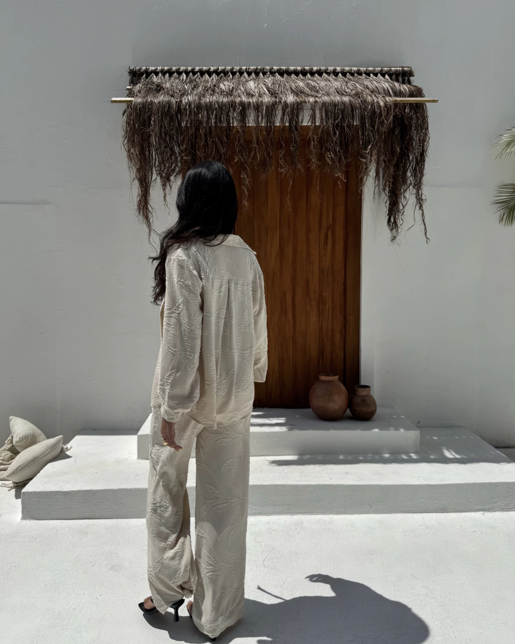 Possui estampa sofisticada integrada a própria trama do tecido. Disponível nas cores branca e areia. Possui forro, elástico na cintura, bolsos frontais. Tecido fluído, macio e fresco.