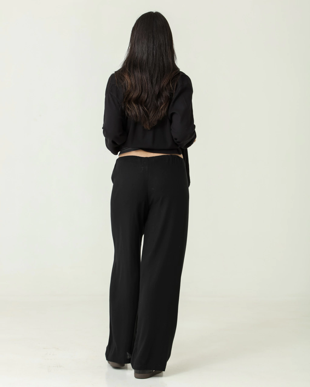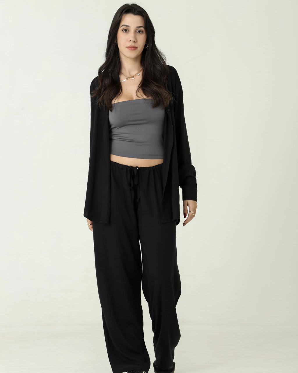 Modelo veste tamanho P da camisa Ella.