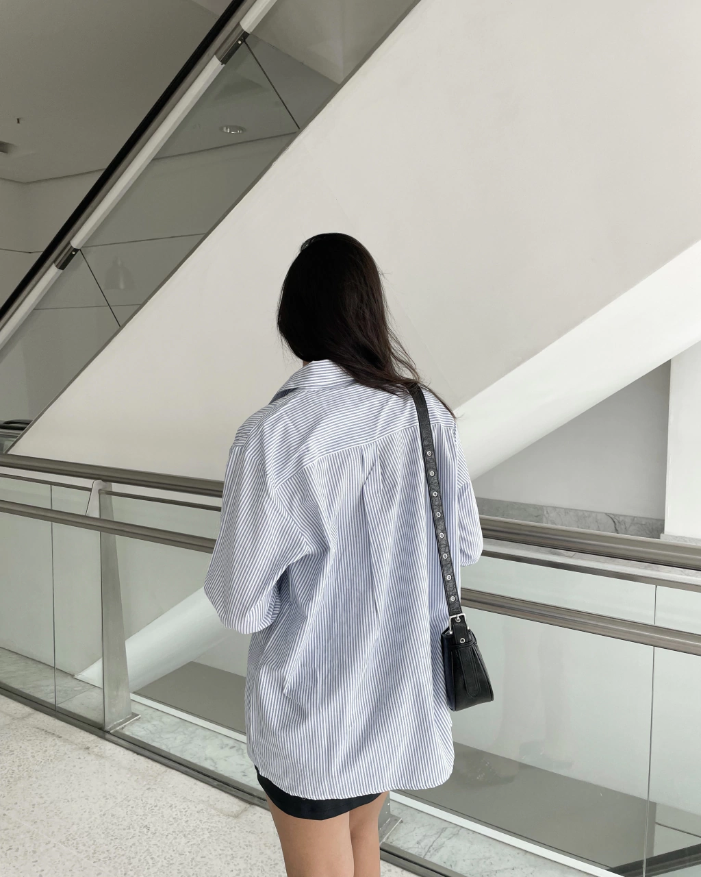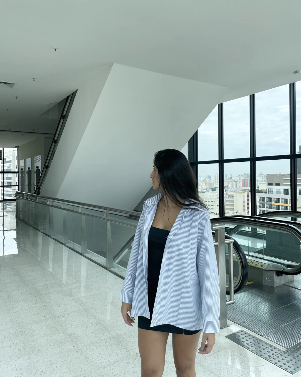 Camisa Nápoles Listrada, possui listras azuis, tem a modelagem oversized, mais ampla, uma peça super em alta, moderna e estilosa. Fechamento frontal e nos punhos por botões. tecido leve e confortável. Combina com todas estações.