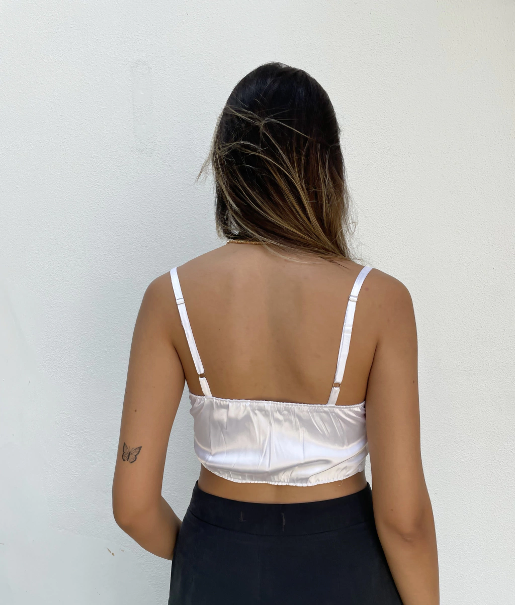 Cropped Paris Branco, Possui amarração na frente, podendo regular o busto e o tamanho das alças, tecido duplo e leve. Não marca nada, pode usar sem sutiã tranquilamente. Perfeito para o verão.