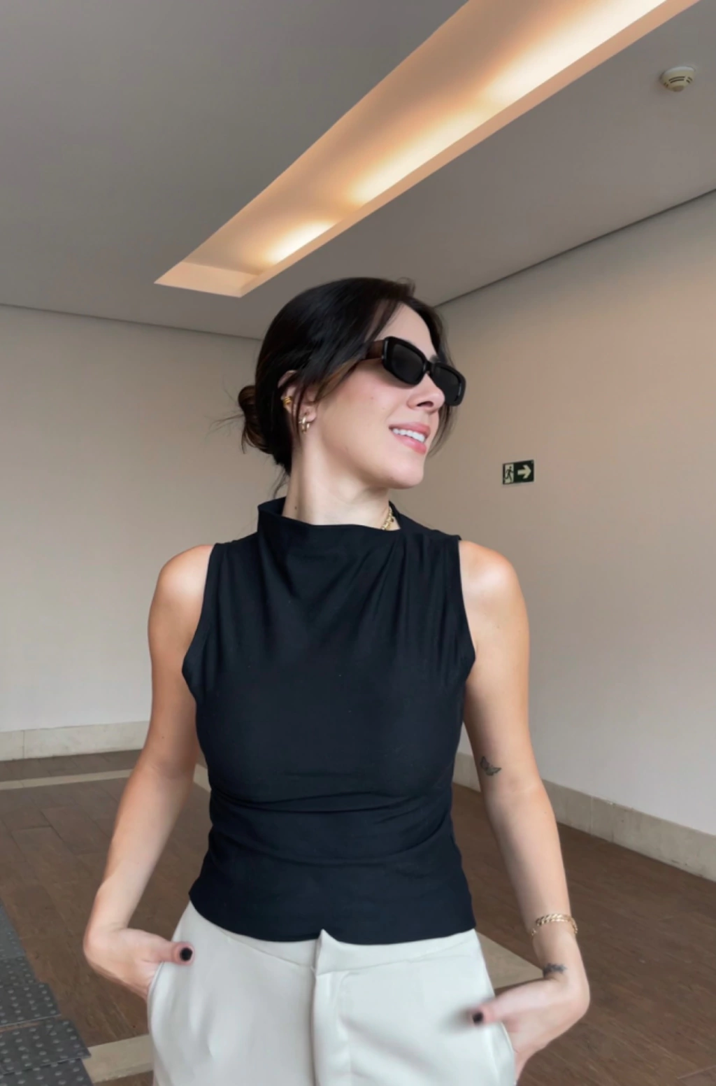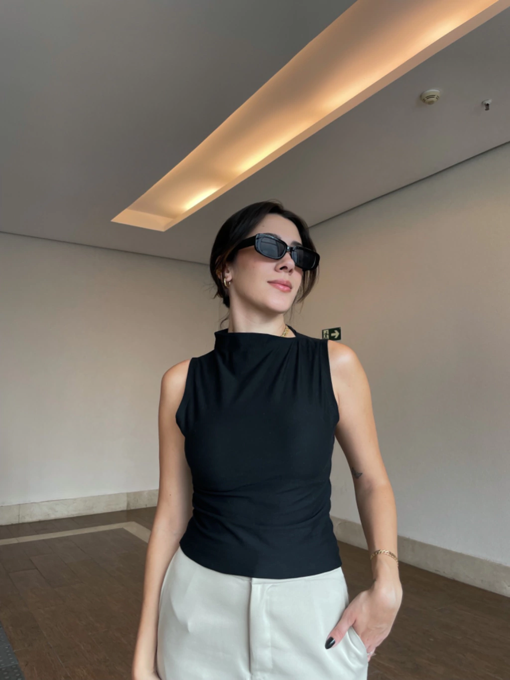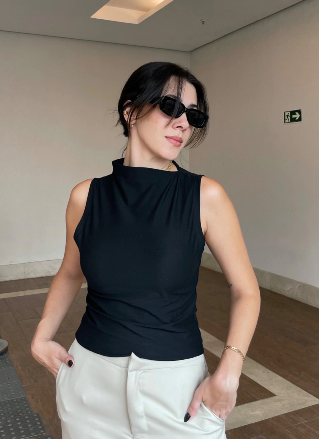 É uma regata de gola alta assimétrica, é uma peça básica com identidade, super sofisticada e confortável, tecido muito macio.