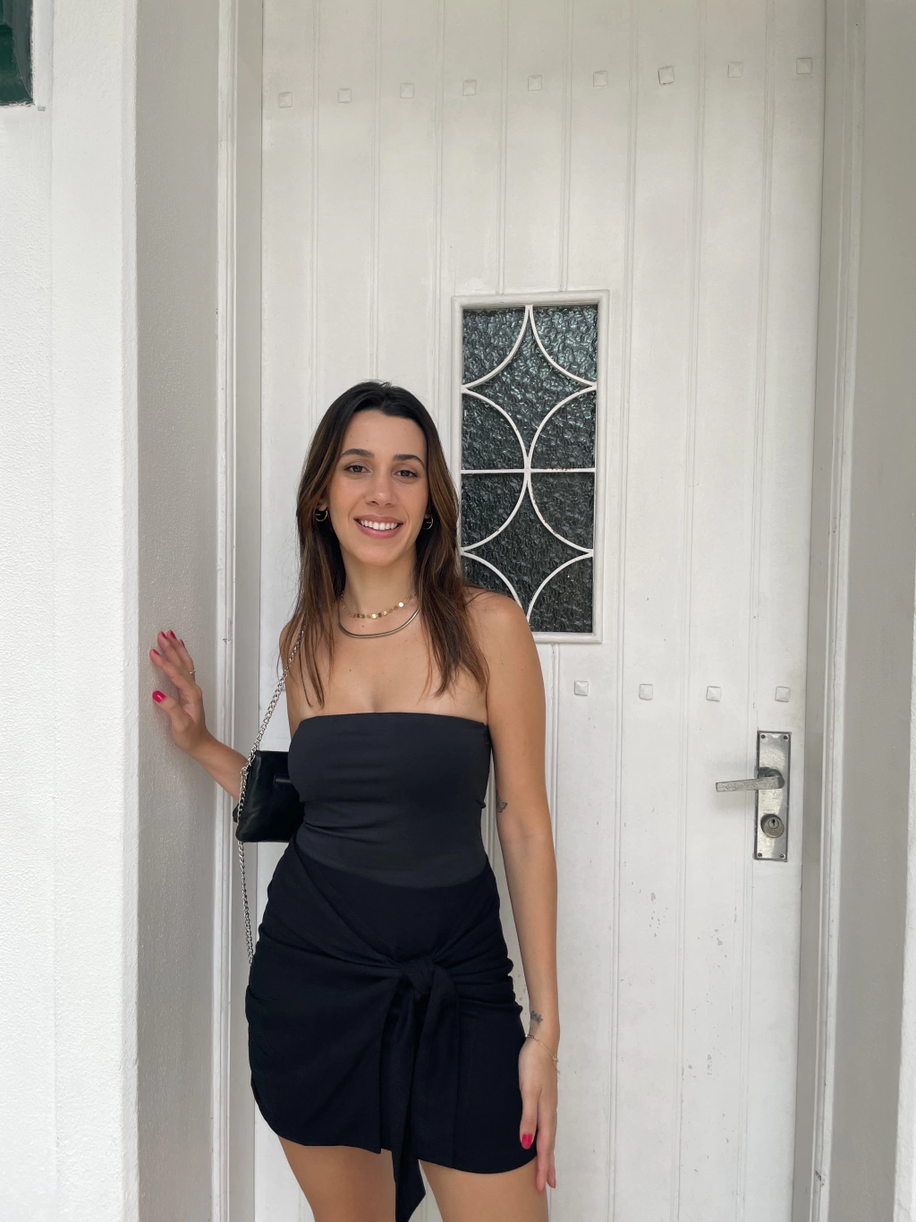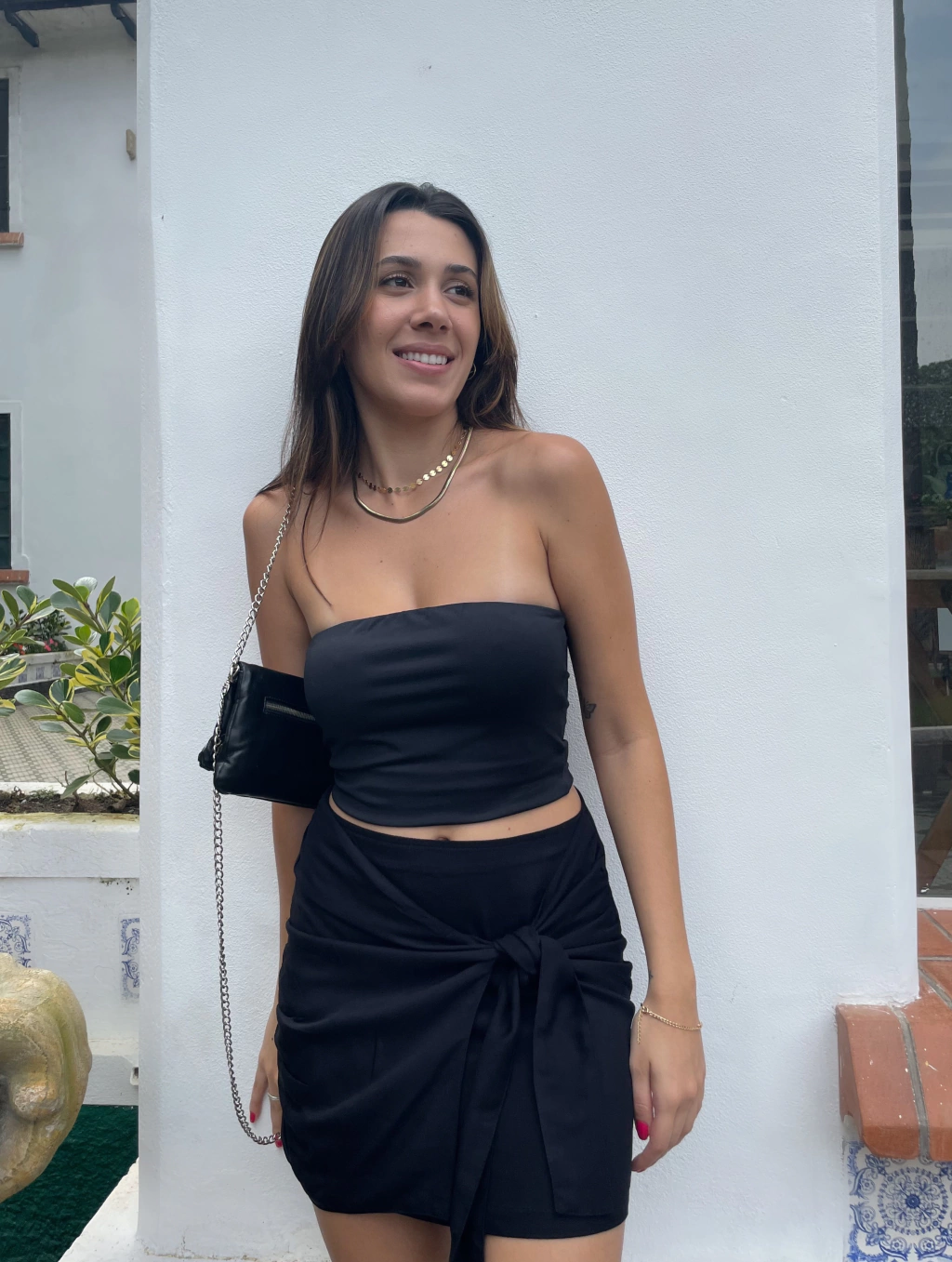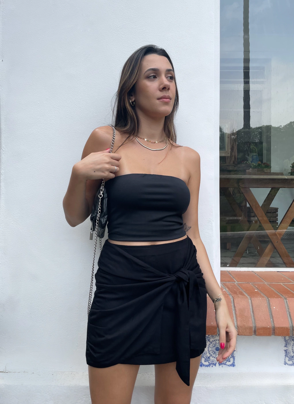 Saia Chloe Preta, uma peça linda, super moderna e versátil. Tecido bem molinho, ótimo para dias quentes. Muito confortável. Possui amarração na frente como detalhe e zíper na parte de trás. Tecido: Viscose Twill Composição: 100% viscose. Tamanho: P- 36/38 M- 40