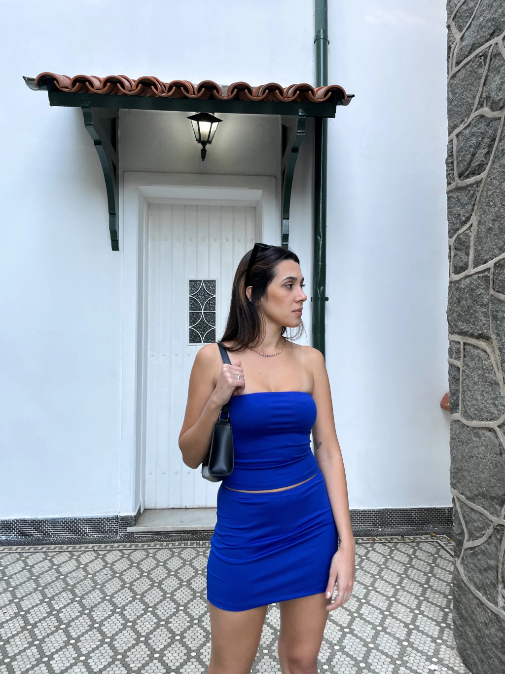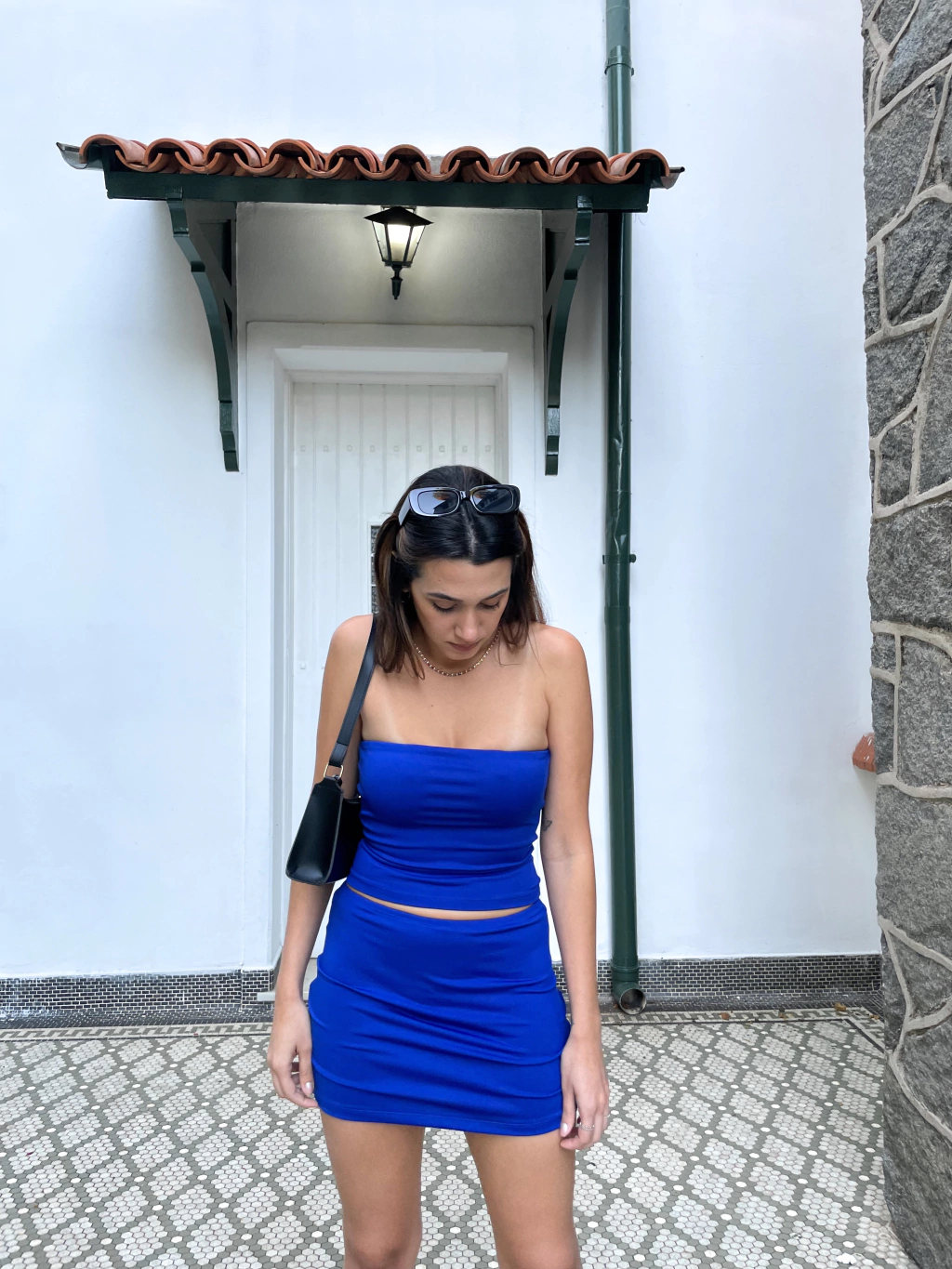 Saia Malta Azul. Mini saia com certeza é uma das maiores tendência atualmente. Nossa saia você consegue usar cintura baixa ou cintura um pouco mais alta, basta você escolher enrugar um pouco ou deixar mais esticada. Modela o corpo, bem justinha e possui tecido firme. Tem elástico na cintura. Faz conjunto com nosso Cropped Malta. Possui bastante elasticidade.